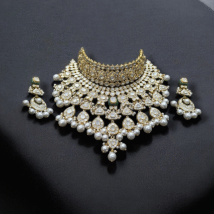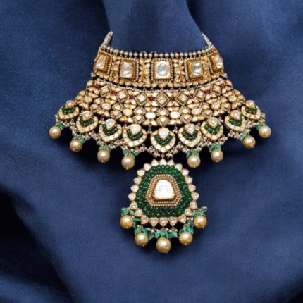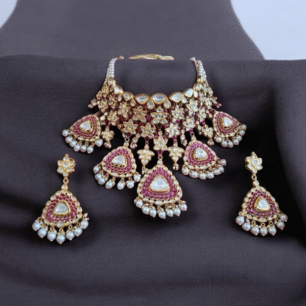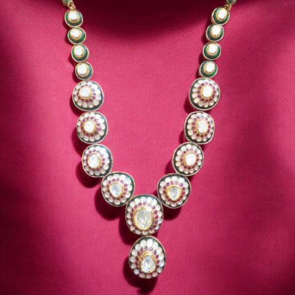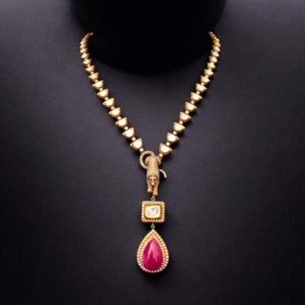 Adorn yourself with the timeless elegance of our Diamond Polki Ruby Necklace, a masterpiece from Taparia Jewels. Designed to capture hearts, this statement piece blends the brilliance of diamonds with the vibrant allure of rubies, perfect for brides and jewelry connoisseurs. Diamond Polki Ruby Necklace by Taparia Jewels, Jaipur – Adorn yourself with the timeless elegance of this captivating masterpiece, handcrafted by Taparia Jewels—purveyors of fine jewellery since 1986. This statement necklace showcases the perfect union of sparkling uncut Polki diamonds and the vibrant allure of rich red rubies, designed to enchant from every angle. Whether worn by a radiant bride or a true jewellery connoisseur, this piece exudes regal sophistication and heritage charm. Rooted in Jaipur’s artisanal legacy, it’s more than jewellery—it’s a timeless symbol of beauty, grace, and celebration.