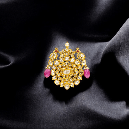 Bursting with vibrant joy, the Floral Polki Yellow Sapphire Brooch features a dazzling yellow sapphire at its core, surrounded by Polki diamonds and delicate gemstone accents. Its floral design symbolizes prosperity and new beginnings, making it a meaningful gift or a standout piece in your festive collection.