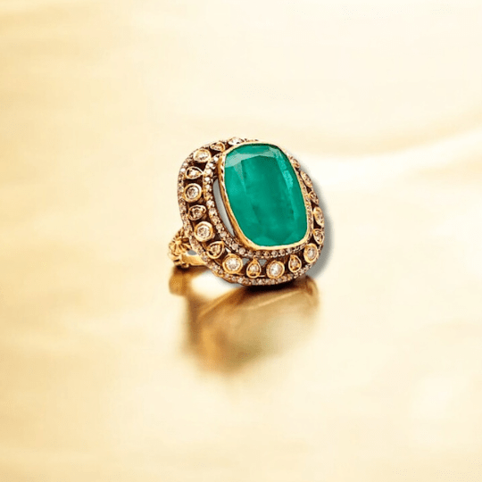 Perfect for brides, collectors & lovers of heritage jewelry. Step into a world of timeless splendor with this exquisite Emerald Polki Ring, where the allure of old-world charm meets the vibrancy of natural gemstones. At its heart lies a natural Zambian emerald, renowned for its lush green hue, remarkable clarity, and deep symbolic ties to wisdom, renewal, and eternal love. Polki diamonds, beloved for their raw, unpolished form, evoke a sense of royal heritage and artisanal authenticity.