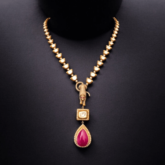Make a statement with the exquisite Ruby Polki Pendant from Taparia Jewels, blending traditional charm with modern elegance. The vibrant ruby and dazzling polki diamonds create a timeless piece that’s perfect for adding a regal touch to your style. Elevate your ensemble with the striking beauty of the Ruby Polki Pendant, a stunning creation from Taparia Jewels that effortlessly blends the richness of tradition with the sophistication of modern design. This pendant is not merely an accessory—it is a statement of grace, heritage, and refined taste.